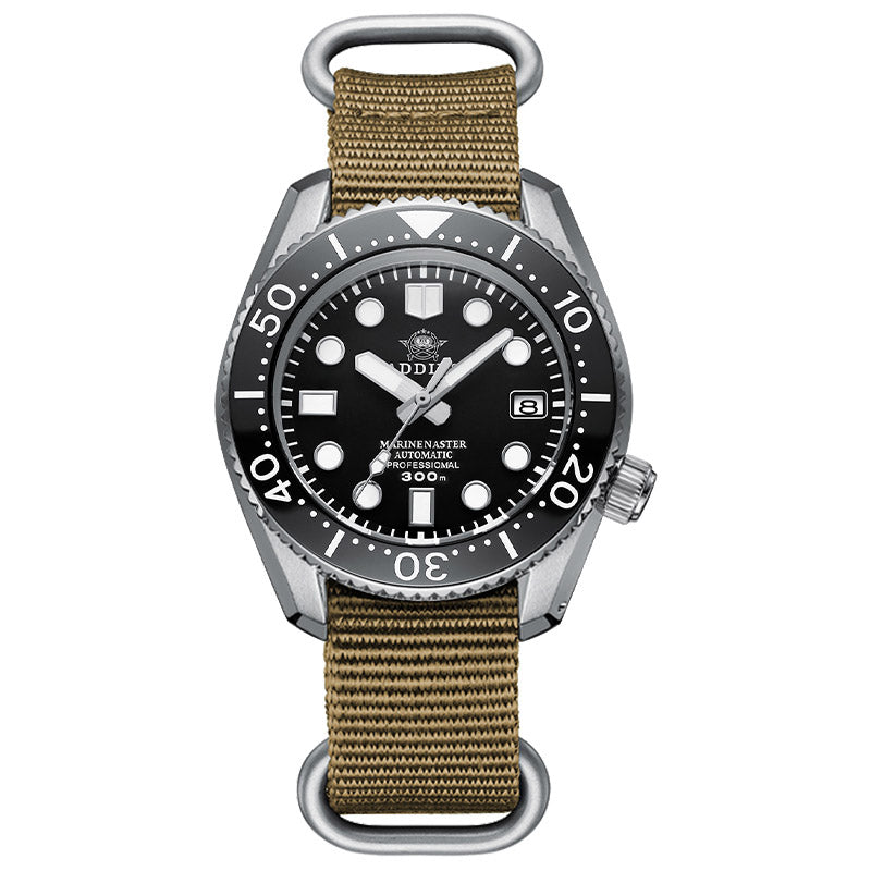 The ADDIES 300M Nato Automatic Diver Watch is an elegant timepiece made from marine grade 316L stainless steel. The rugged Nato strap makes wearing the piece comfortable and secure. With high vis luminous pointers and 300M water resistance, it's an elegant watch for any water activity as well as a sophisticated timepiece for everyday use.