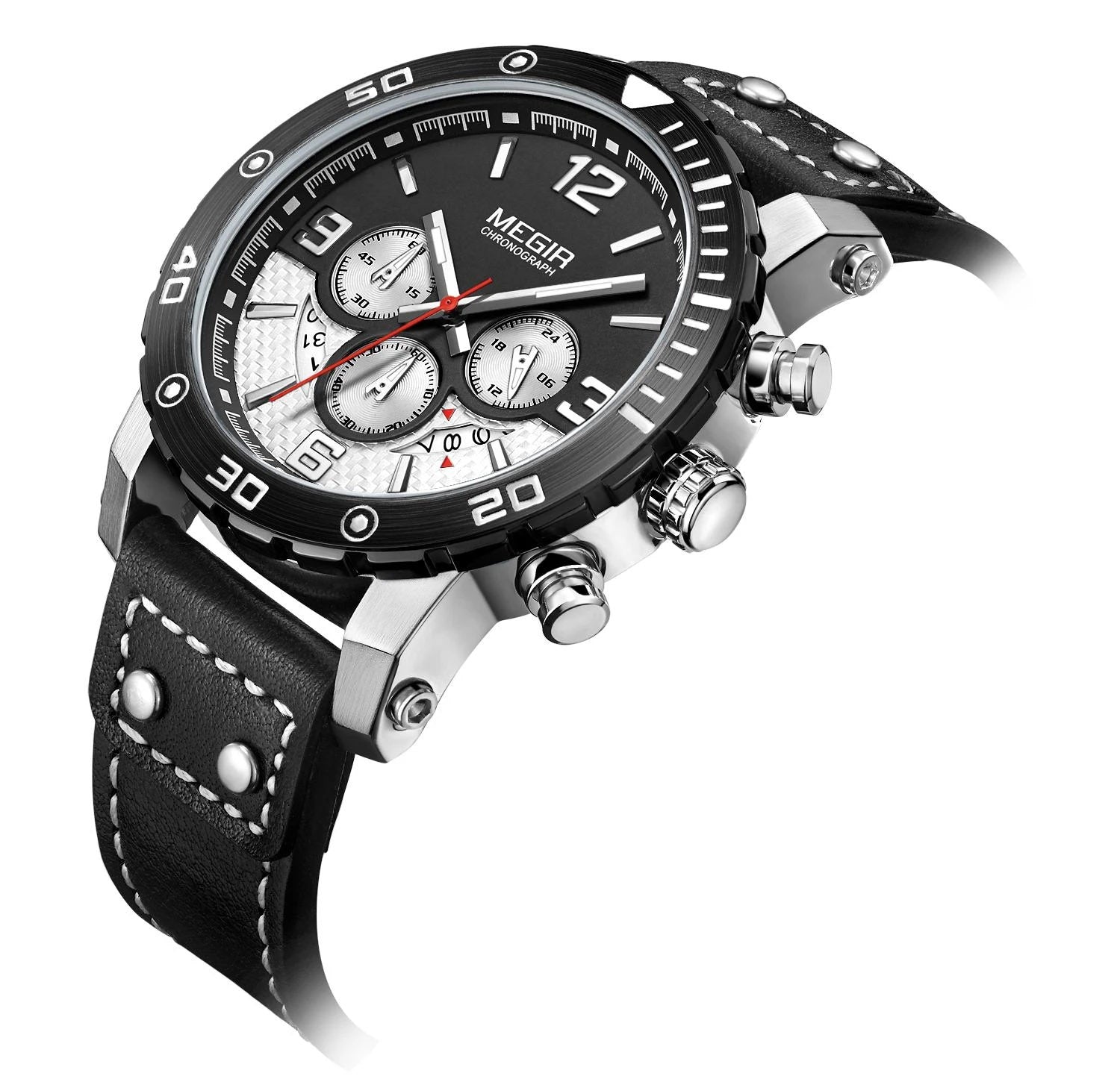 The MEGIR 2084 Sport Quartz Chronograph is elegant and sophisticated reminiscent of vintage sports detailing. The Quartz movement timepiece has all the features of a high-end chronograph like minute, second and hour dials as well as stopwatch function. A perfect addition to any sports watch enthusiast.