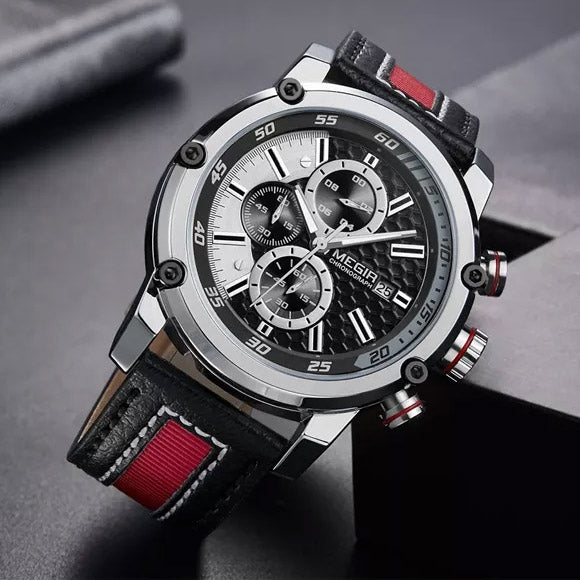 The MEGIR 2079 Quartz Chronograph is a sophisticated timepiece with racing inspired styling. Functions include, stop-watch, 24 hour and minute dials along with water resistance and a rugged premium leather strap. It's the perfect watch at the racetrack or office.